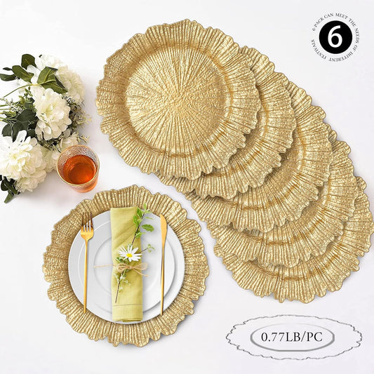round 13" Gold Charger Plates, Set of 6, Reef Plate Chargers for Dinner Plates, Plastic Table Chargers for Wedding, Thanksgiving, Christmas