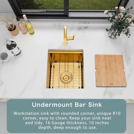 Gold Bar Sink Undermount, 15" X 17" Stainless Steel Bar Prep RV Sink, 16 Gauge Workstation Sinks, Small Single Bowl Kitchen Sinks with Cutting Board and Accessories